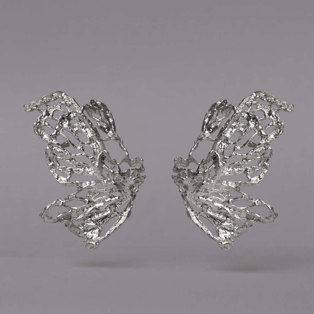 Statement butterfly ear cuffs handcrafted from solid 925 sterling silver. These striking cuffs gracefully curve to hug the ear without the need for piercings. A unique sculptural piece combining lightness with bold presence, inspired by the delicate symmetry of butterfly wings.
