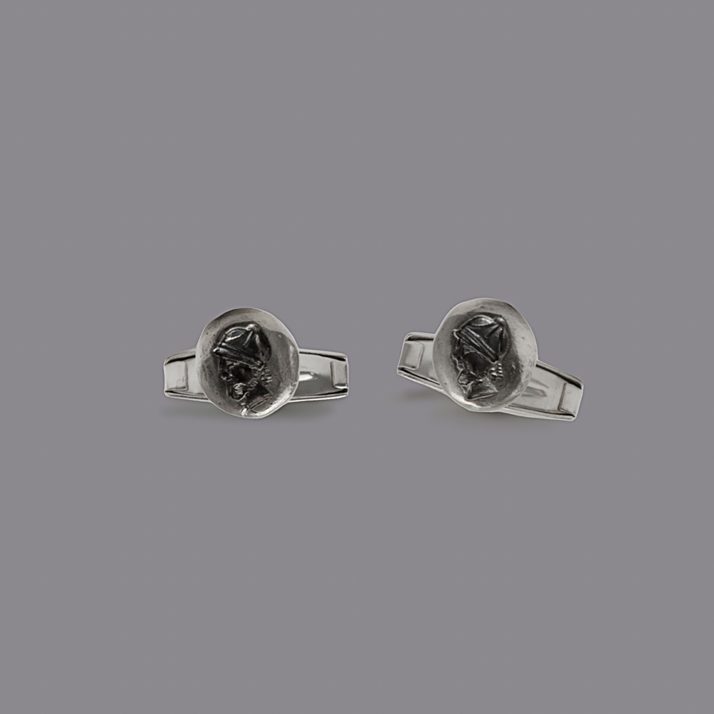 These handmade cufflinks are crafted from solid 925 sterling silver and feature detailed engraving inspired by classic military motifs. Their sculptural, minimal design makes them a refined accessory for formal occasions or daily wear. Each pair reflects meticulous craftsmanship and the natural elegance of silver.