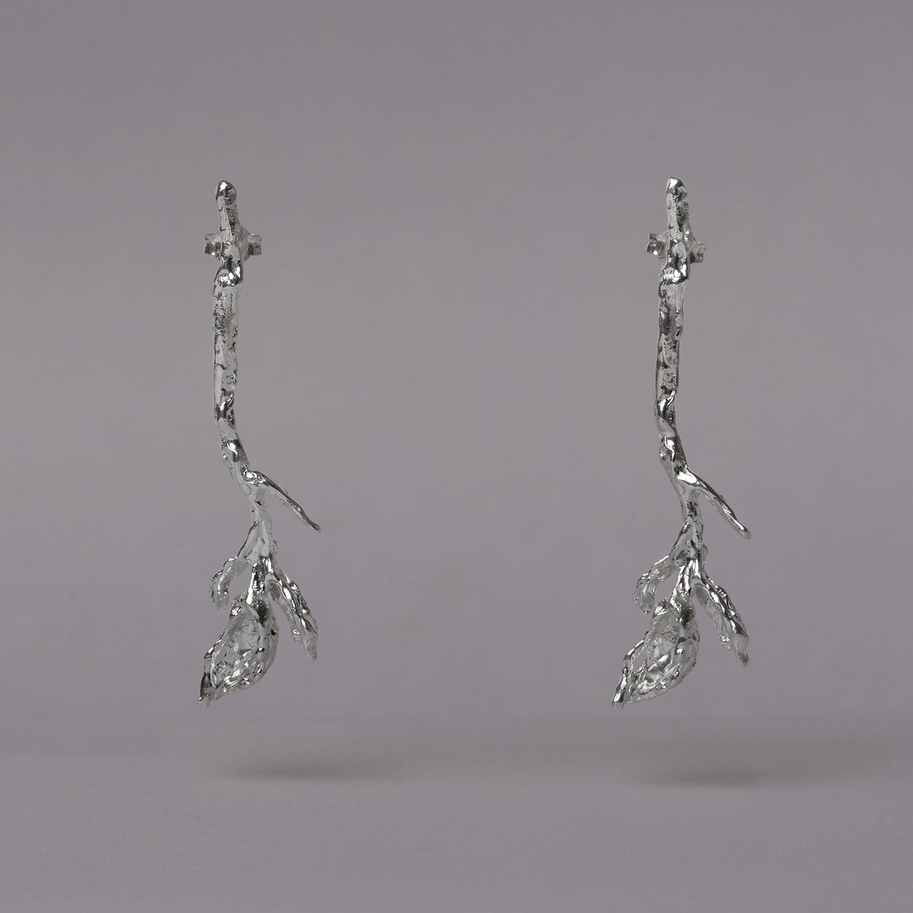 Delicately sculpted by hand, these botanical-inspired earrings capture the graceful form of blooming flower branches. Crafted from solid 925 sterling silver, they offer a poetic balance between elegance and natural texture. Lightweight yet striking, they flow effortlessly from day to night. Each pair is subtly unique — a quiet celebration of craftsmanship and organic beauty.
