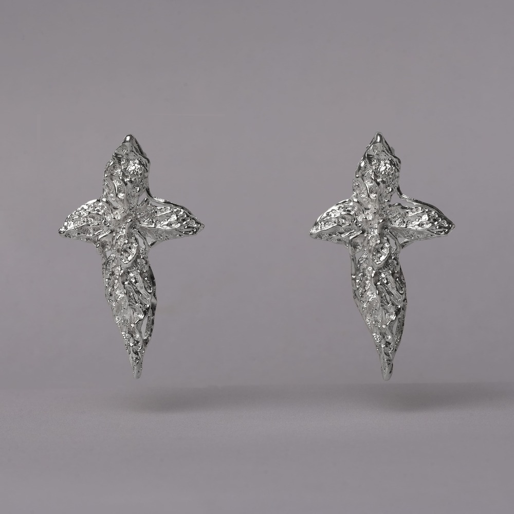 A delicate interplay of symbolism and nature, these handmade earrings form a cross from finely sculpted silver leaves. Crafted from solid 925 sterling silver, they reflect quiet strength and organic grace. Unique in design, they offer a subtle statement — thoughtful, modern, and deeply rooted in natural forms.