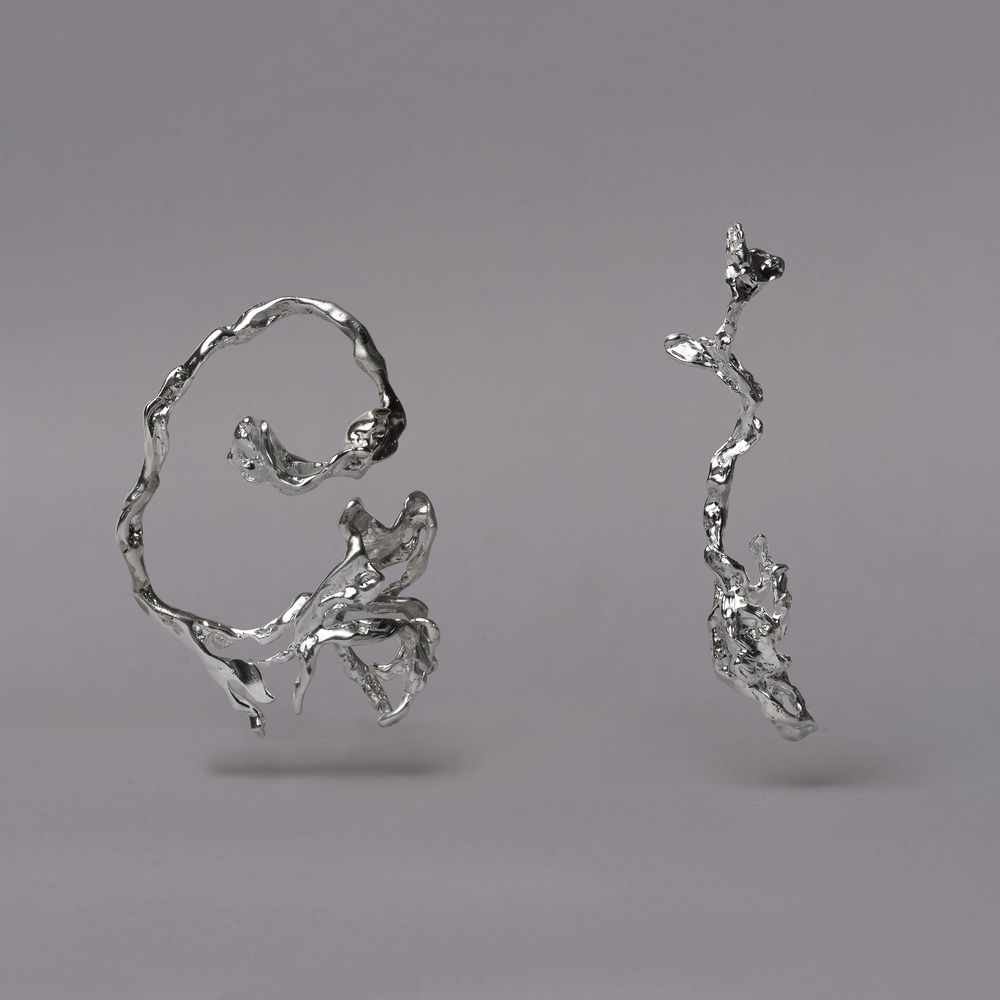 Delicate yet sculptural, these handmade ear cuffs bloom with floral shapes that wrap gracefully around the ear. The pair is intentionally asymmetrical: one piece is a non-pierced ear cuff that hugs the ear, while the other is a classic stud earring that requires a piercing. Crafted in solid 925 sterling silver with a polished and textured finish, they merge botanical elegance with a bold, contemporary edge. Statement simplicity — reimagined.
