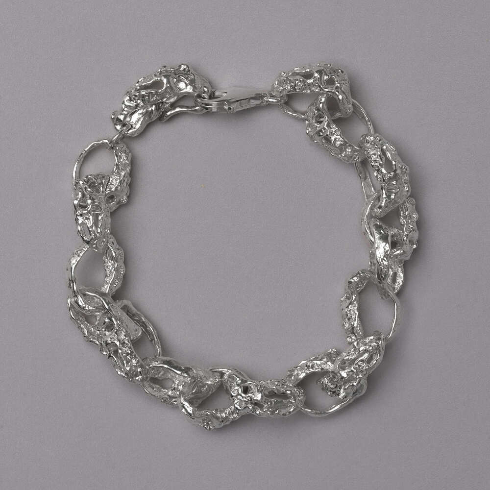 Crafted by hand, this sculptural bracelet features organically shaped links that echo the imperfect beauty of nature. Made from premium 925 sterling silver, it embodies refined minimalism and quiet strength. Each piece is slightly unique — a wearable form of raw elegance. Ideal for layering or wearing solo, from everyday moments to elevated occasions.