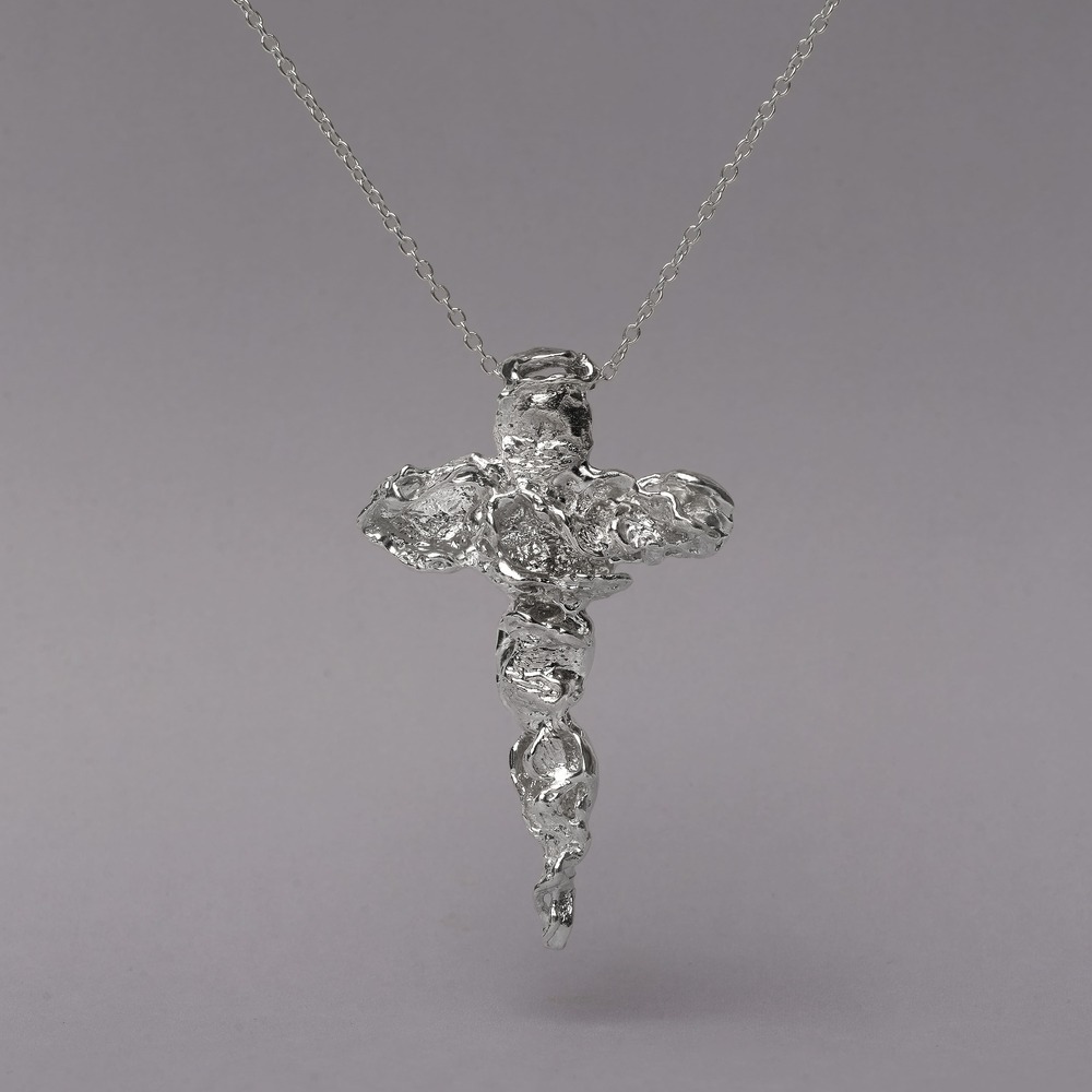 Raw and symbolic, this handcrafted cross pendant is inspired by the rugged texture of tree bark. Sculpted in solid 925 sterling silver, it blends natural roughness with sacred form — a striking piece that evokes strength, resilience, and earthbound grace. Each pendant is made by hand in Greece, with attention to texture and meaning.